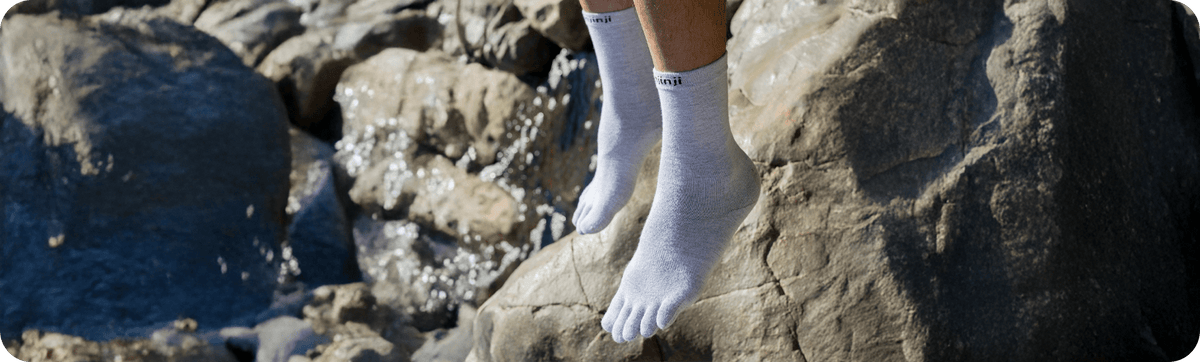 Waschen Sie Ihre Injinjis in der Maschine im Schonwaschgang. Das Trocknen Ihrer Socken an der Leine ist die beste Methode, um die Qualität der Sockenfaser zu schützen. Bleichen, bügeln oder reinigen Sie Ihre Injinji-Socken nicht. Wir empfehlen Ihnen außerdem dringend, Ihre Zehennägel zu kürzen, um vorzeitigem Verschleiß vorzubeugen.