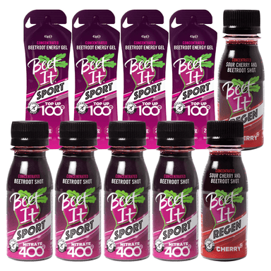 The Race Day Pack offers everything runners need for optimal performance and recovery. This pack includes 4 x Beet IT Nitrate 400 Shots, 2 x Beet IT Regen Cherry+ Shots and 4 x Beet IT Top Up 100 Gels.