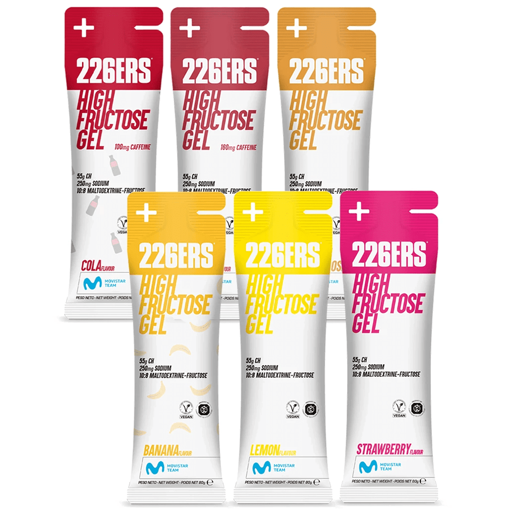 226ERS High Fructose Gel is built around the science of multiple transportable carbohydrates. By combining maltodextrin and fructose in a 10:8 ratio, it leverages different intestinal absorption pathways; GLUT2 for maltodextrin (glucose) and GLUT5 for fructose, allowing the body to absorb and oxidise more carbs per hour than single-source gels. This results in sustained energy, less gastrointestinal distress, and better performance over long distances.